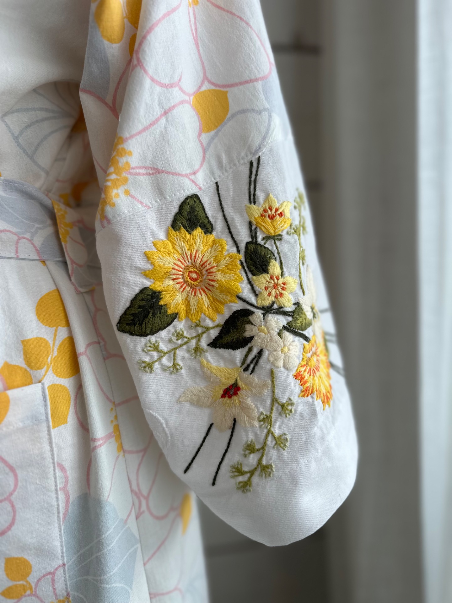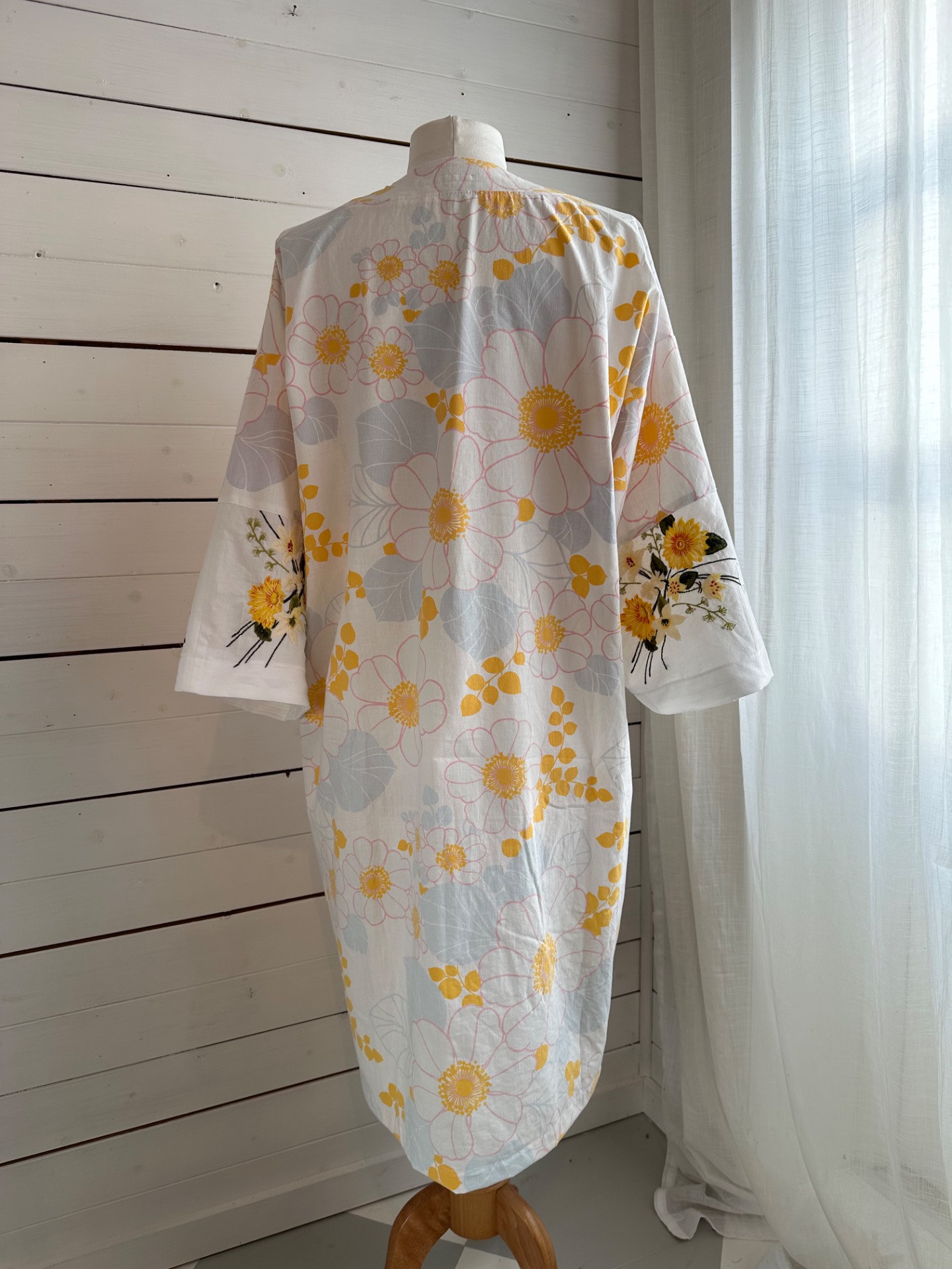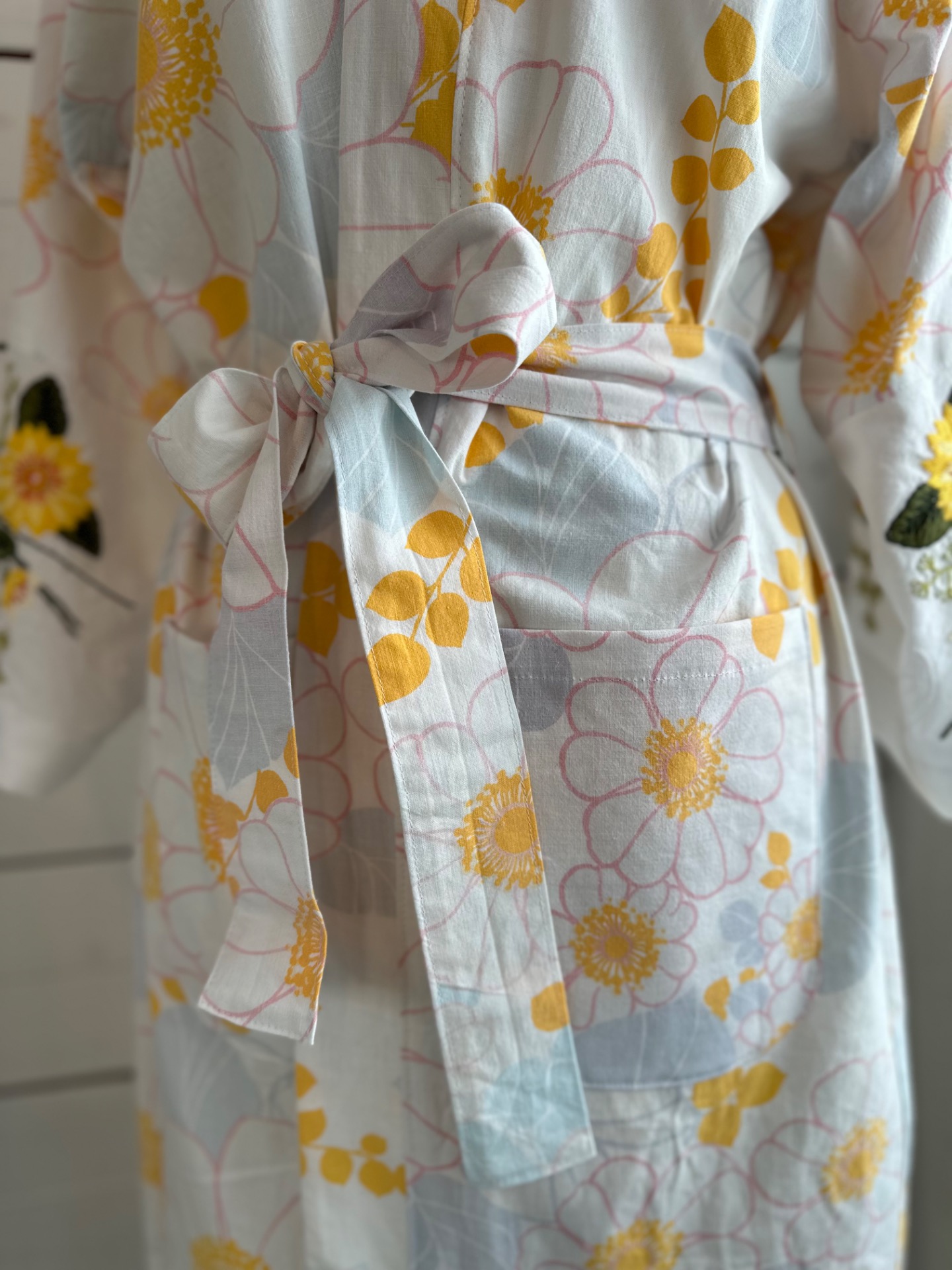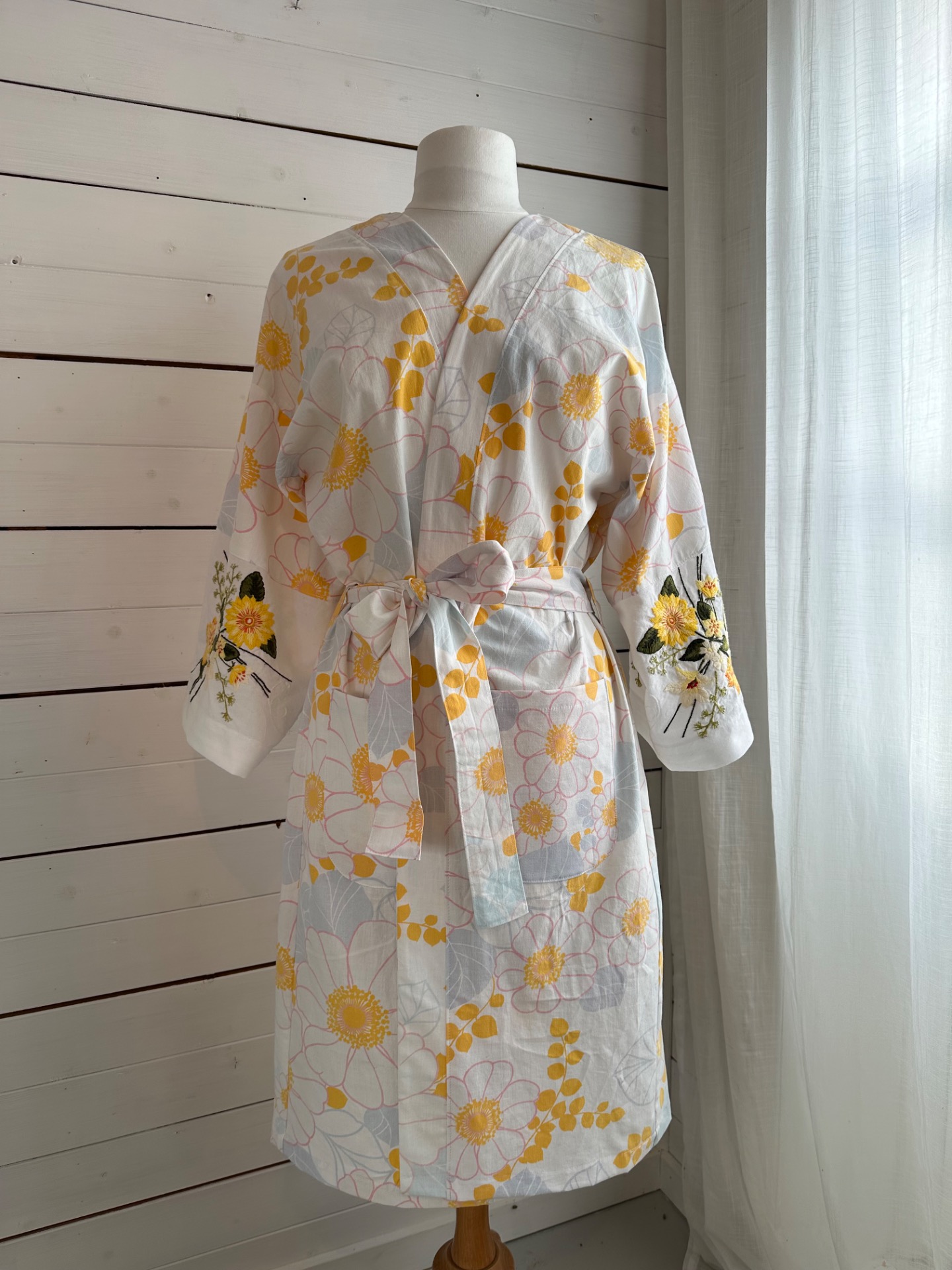 Blomstret kimono i vintagestof fra 80’. Skønt mønster i lyserødt, gult og lyseblåt. På armene er der et broderet stof. Lommer og bånd. 100% genbrugStr. 36-40